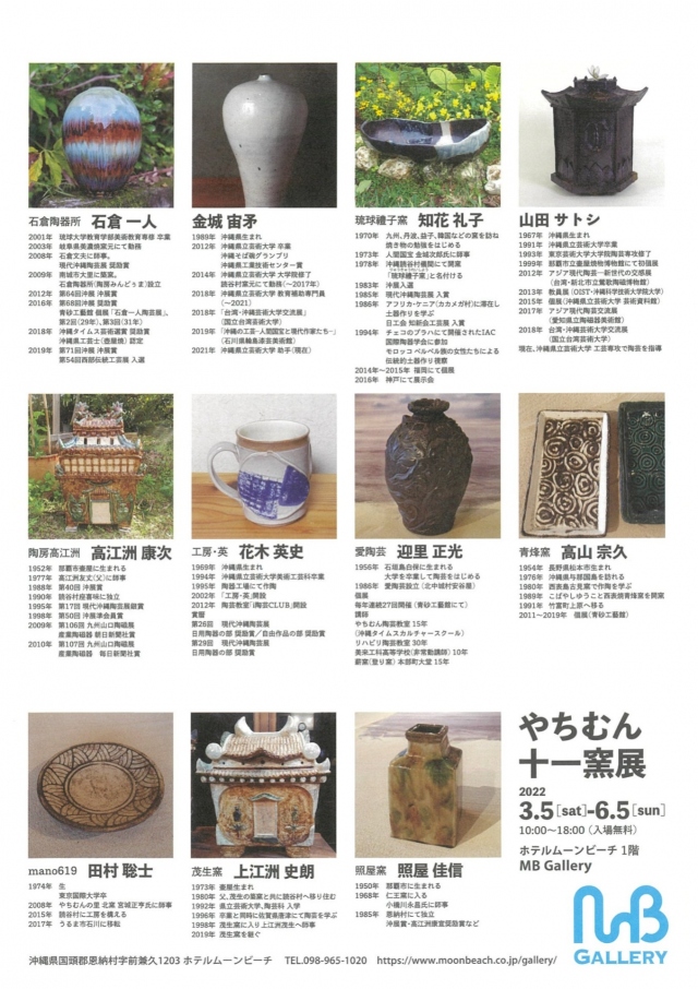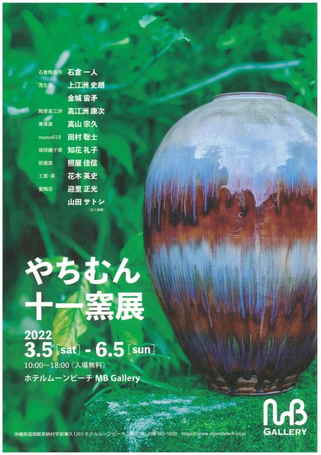 ホテルムーンビーチ、MBギャラリーでは下記の要項で新企画展を開催しております。 伝統的な技法に重きをおいた作品から、そこに個性も中和させた作品まで様々な「やちむん」が展示されております。匠の技をご堪能ください。 企画展「やちむん十一窯展(じゅういちようてん)」 開催期間:2022年3月5日(土)~6月5日(日) 開催時間:10:00~18:00 開催場所:ホテルムーンビーチMBギャラリー 入場無料