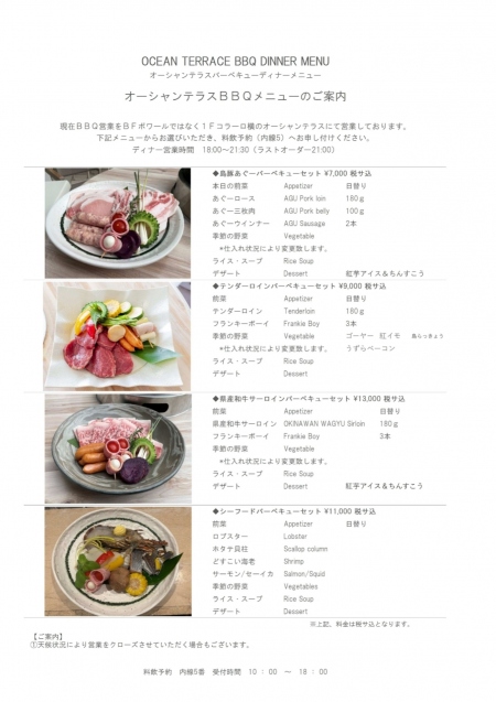 オールデイダイニング「コラーロ」内BBQテラスエリアでは、アグーBBQ・シーフードBBQ・和牛サーロインBBQに加えテンダーロインBBQをご用意いたしました。
