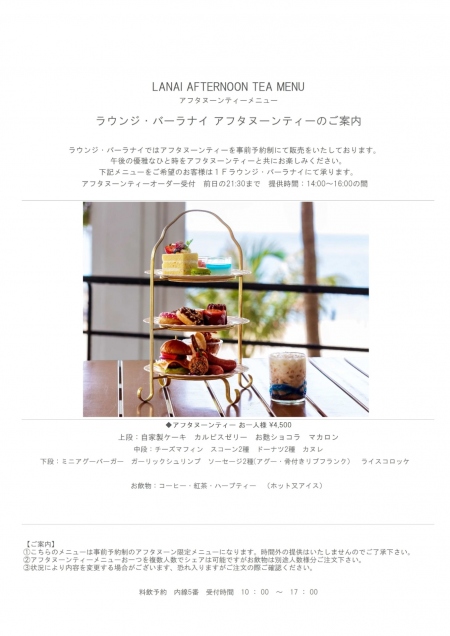ラウンジ・バー「ラナイ」では、新たに内容を変更し”アフタヌーンティー”をご用意いたしました。